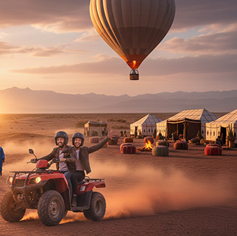 Un terrain plus sauvage, plus sportif et plus spectaculaire. Possibilité d’ajouter : coucher de soleil, dîner spectacle, piscine, camp de luxe, dromadaire.