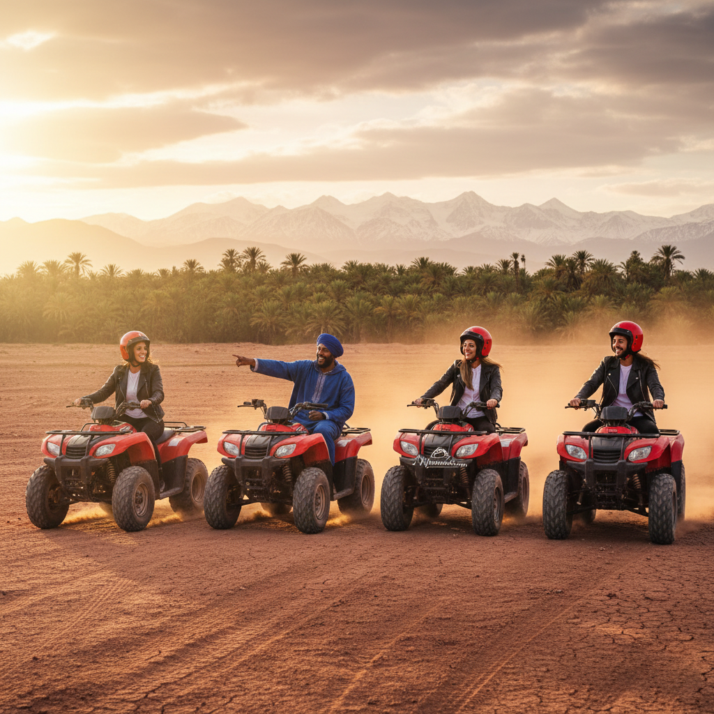 Profitez d’une escapade hors du temps à bord de votre quad dans le désert de Marrakech, entre dunes de sable, paysages désertiques, palmiers de la Palmeraie et villages berbères. Avec My Marrakech Trip, bénéficiez des tarifs les plus accessibles du marché, d’une organisation professionnelle et d’un encadrement sécurisé, pour une expérience adaptée à tous : familles, couples, amis, enterrement de vie de célibataire, team-building…